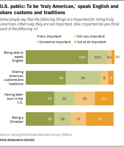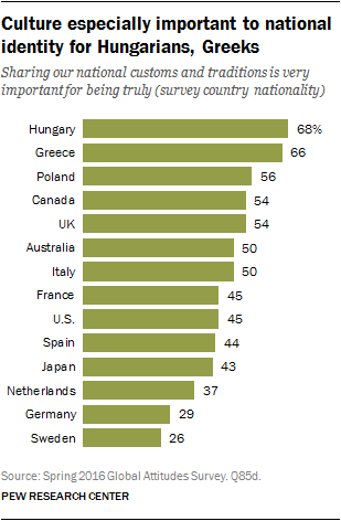 A Pew Research Center nyilvánosságra hozta annak a világméretű kutatásnak (What It Takes to Truly Be ’One of Us’) az eredményét, amely azt vizsgálta, hogy a különböző országokban az emberek mit tekintenek a nemzeti identitás legfontosabb alkotóelemeinek. A vizsgált országok: USA, Canada, több európai ország, köztük Magyarország, valamint Ausztrália és Japán. A kérdés az volt, hogy az adott országban a nemzeti identitás szempontjából az emberek mennyire tartják fontosnak a születési helyet, a nyelvet, a szokásokat és hagyományokat, és a vallást. Az egész anyag ismertetésére itt nyilván nincs mód. Aki tud angolul, s érdeklődik ilyen kérdések iránt, annak érdemesebb hosszabb időt is szentelnie erre a kutatásra. Bennünket nyilvánvalóan elsősorban Európa, s azon belül Magyarország érdekel, s az az izgalmas lehetőség, hogy még egy laikus éreklődőnek is lehetősége nyílik az egyes európai országok kulturális karakterének összehasonlítására. A Pew Research Center által közölt eredményből az mutatható ki, hogy Magyarország sok tekintetben az egyik legkonzervatívabb európai ország. S annak megítélése, hogy ez "baj"-e, avagy sem, nyilván politikai-ideológiai beállítódás kérdése. Ha úgy tetszik, a kutatási eredmény "igazolhatja" a magyarországi népességről alkotott, jól ismert negatív képet (idegengyűlölet, bezárkózás, maradiság, "mucsaiság", stb.), másrészt alátámaszthatja azt a vélekedést is, hogy a magyarok nagy része ellenáll bizonyos nyugati, a nemzeti identitást veszélyeztető tendenciáknak. Mintha megfordulni látszana egy ismert évszázados trend: az Európán belüli Nyugat szellemisége már nem feltétlenül és nem mindenben vonzó példaként jelenik meg a magyarok nagy része számára.