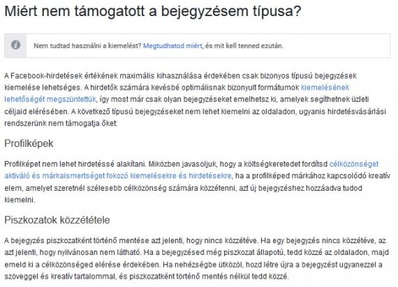 A Facebook felajánlja azt a lehetőséget, hogy az adminisztrátor utána nézzen, vajon a bejegyzése miért nem támogatott? Ekkor a Miért nem támogatott a bejegyzésem típusa? c. oldal nyílik meg, amely egy általános leírás, hosszú szöveg. Sajnos az egészet nem tudom ide bemásolni kép gyanánt, de akit érdekel, elolvashatja végig.